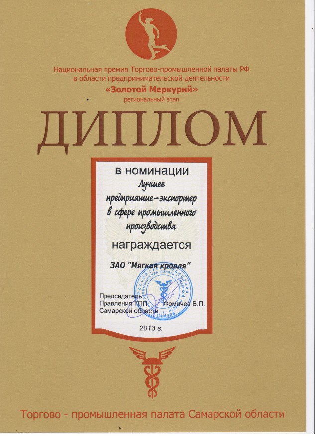 Завод «Мягкая кровля» получил премию ТПП в номинации «Лучшее предприятие-экспортер» в сфере промышленного производства». Завод снабжает своей продукцией Европейский регион России, регионы Сибири и Дальнего Востока. Продукцию хорошо знают в Казахстане, Таджикистане, Азербайджане, Киргизии, Туркмении.