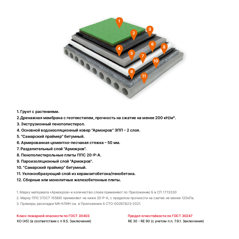 Система эксплуатируемой кровли с зелеными насаждениями, с утеплением пенополистирольными плитами по железобетонному основанию. СТО-00287823-2021